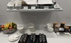 At first glance, this seems like quite a decent breakfast. Not very extensive perhaps but quite varied. Unfortunately, the first glance turns out to be somewhat misleading. Yes, it’s a nice little spread. However, the scrambled eggs are not particularly nice; the sliced bread is not toasted; my tea mug…