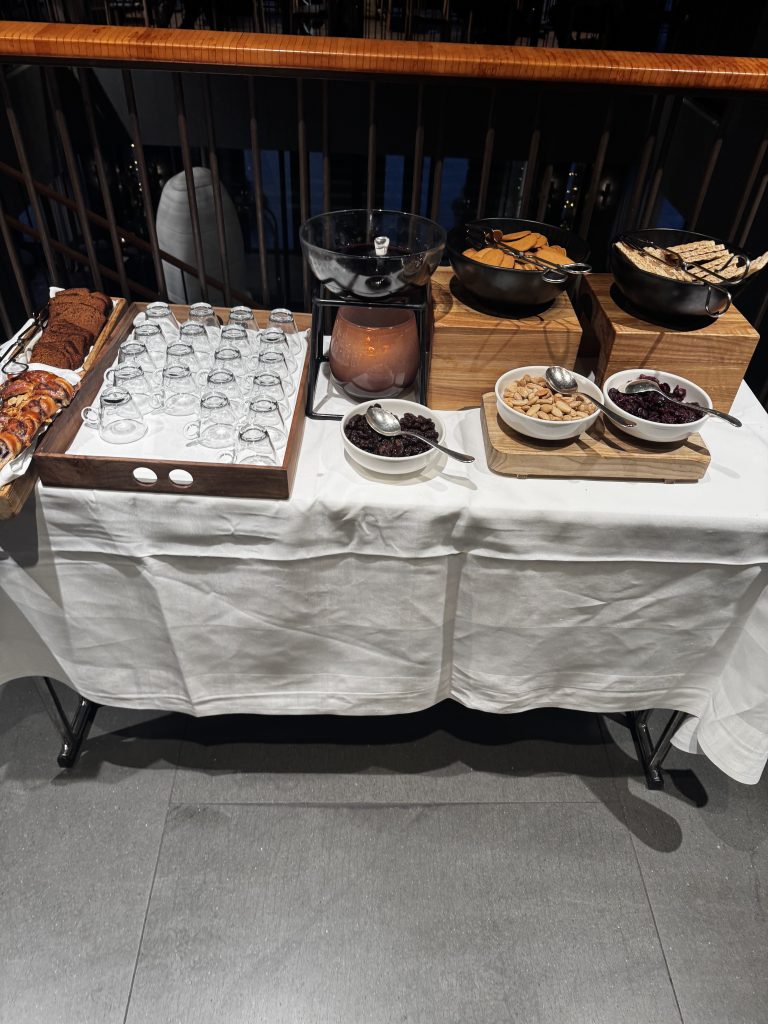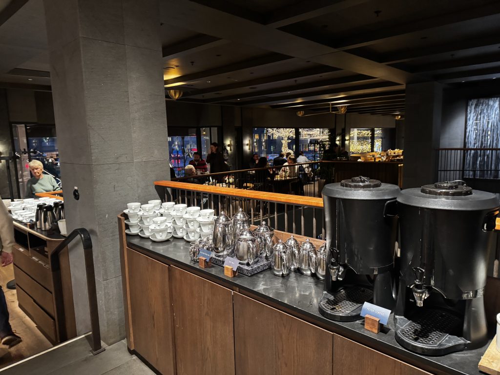 Now, for this breakfast. One of the themes I consistently go on about, is that bigger is not necessarily better. This is an excellent illustration thereof. The buffet is not particularly large, but it is well balanced with a wide range of tasty dishes. In other words, good choice of vegetables, cold cuts, cheese as well as both salmon and herring (this is Sweden, after all!). A nice hot bar, with waffles and pancakes, good scrambled eggs and crispy bacon, as well as other standard offerings (beans, hard-boiled and fried eggs, tomatoes et cetera). An excellent choice of fruit, both fresh and compotes. Home baked Swedish cinnamon buns, always a plus. On the negative side, the tea is bags only, but it is the hotels own blend which is very nice indeed. One strange aspect is that there is neither normal butter nor normal milk, only lactose-free. You can get normal milk if you ask for it. While offering lactose-free products is of course very worthy, I do think that the alternative should be there without having to ask for it. If normal milk and butter were automatically available, I would have given this 9.5/10; as it is, we end up at 9/10. However, as readers of this blog know, this still means an absolutely excellent, first-class breakfast.