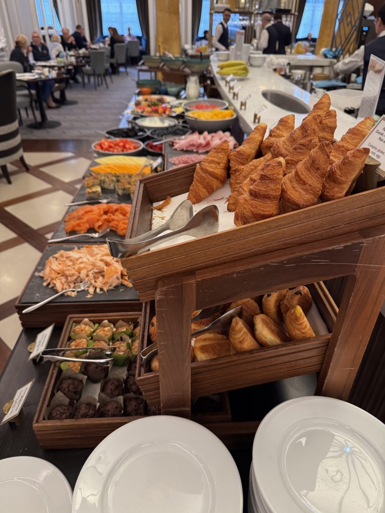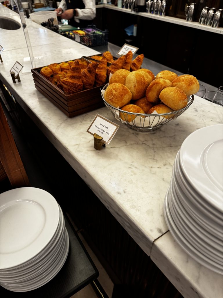 So: previously, the Brooklands restaurant only had a menu option. I don’t know when this changed, but now they have both a menu and a continental buffet, and you can combine them. ‘Continental’ in this case means no hot dishes; but you get this from the menu, and some of them are included in the price of the buffet, while others (like a ‘full English’) will cost extra. Jams, marmalades and honey on the tables. The buffet is small, but reasonably varied, with bread and pastries (nice croissants!), two kinds of salmon and cold cuts. A good spread of fresh (cut-up) fruit. In general, everything is top-quality. We ordered scrambled eggs, which were excellent. On the drawbacks, the tea is bags only (and it shouldn’t be at the RAC!); the cheese choice was limited (two types of sliced English cheese) and no vegetables. But this is still well over average and a major improvement on the past. Definitely worth 6.5/10.