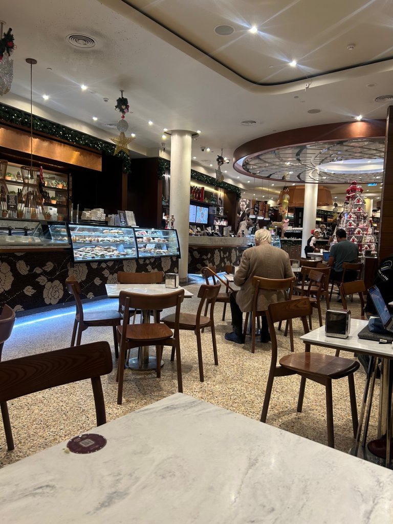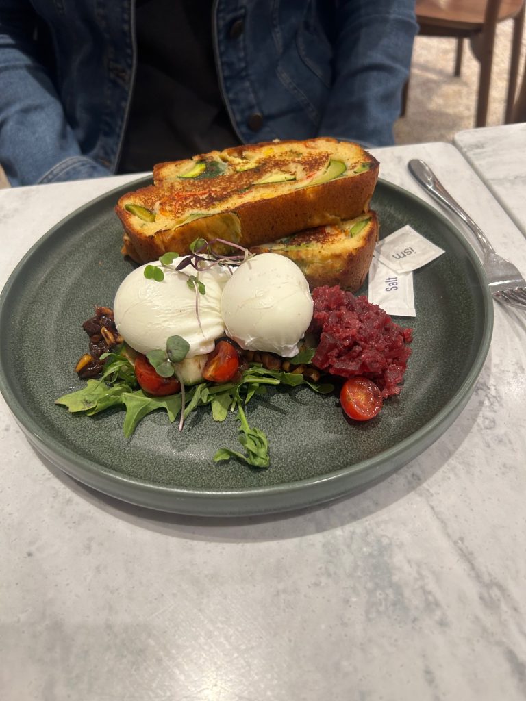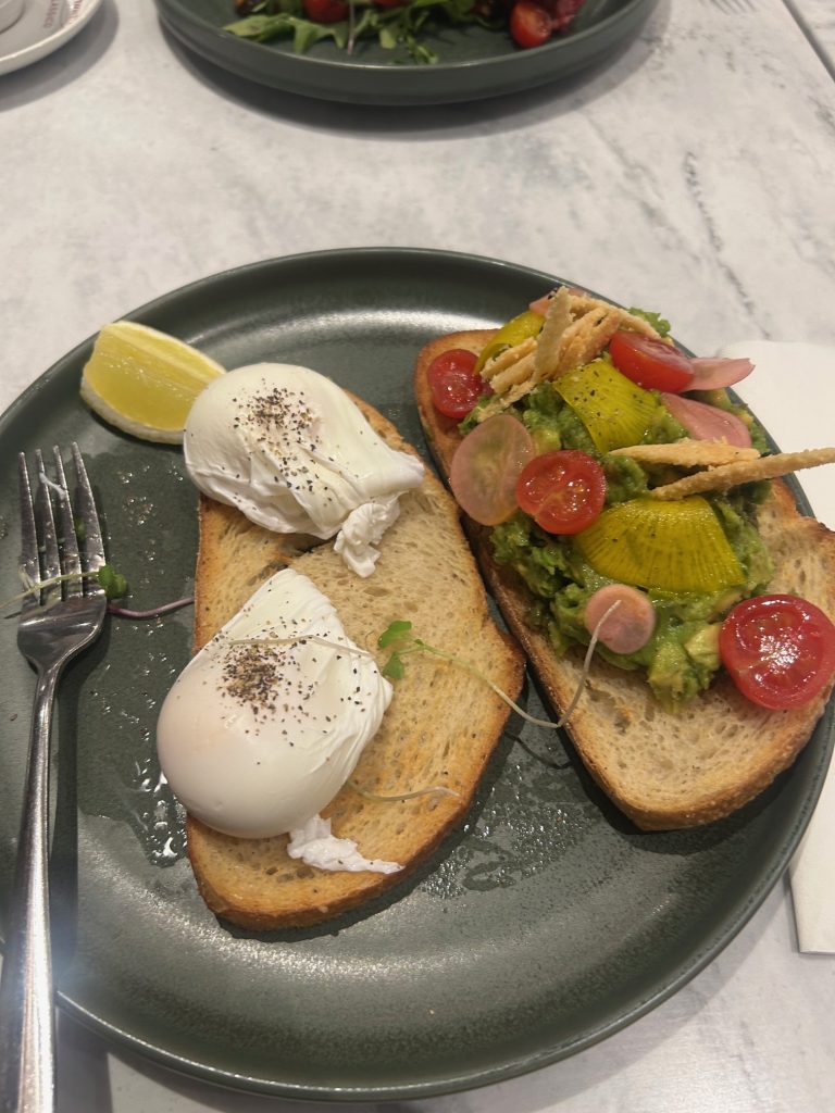 Now on to our experience. We had a couple hours to kill, as we arrived in Melbourne too early to check into our AirBnB. Brunetti’s has a lot of space and we sat from 9:00 to 11:30 without being questioned. As the lunch-time crowd started to arrive, we quietly made our way out. During our time there, I had the staple Australian dish of smashed avocado. It comes with poached eggs and salad on sour dough, with a homemade parmesan cracker. It’s exactly what you would expect for an Australian breakfast and very well done; the eggs are free range and the bread is homemade. My only small complaint is that I’m not a huge fan of salad with eggs. For coffee, I went with the Australian staple of the flat white. Again, very well done and much less expensive than it would be in the UK.