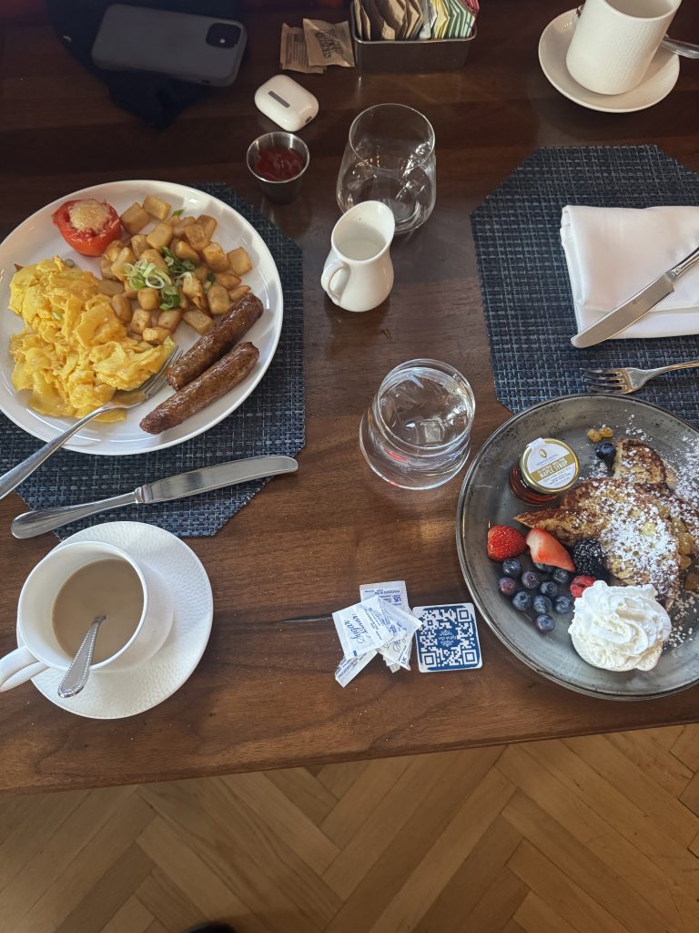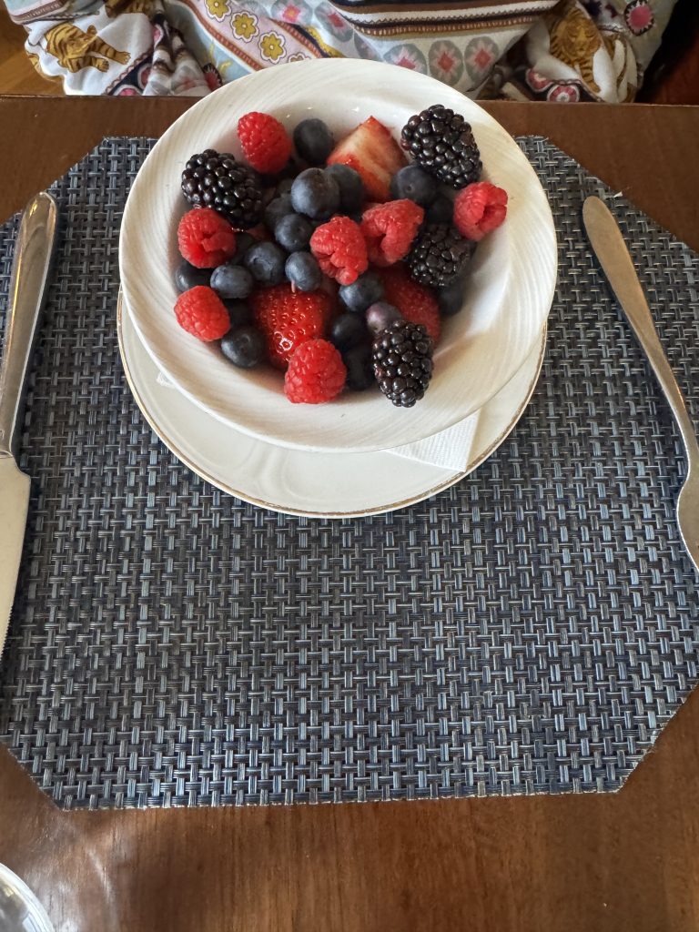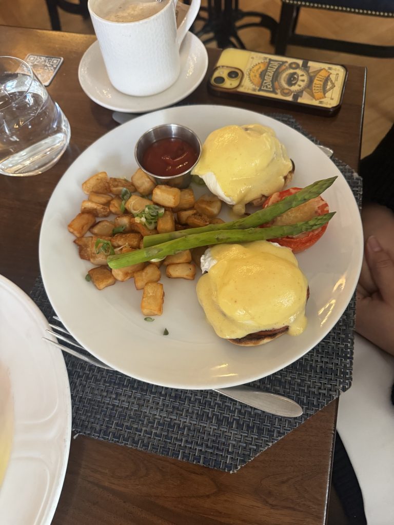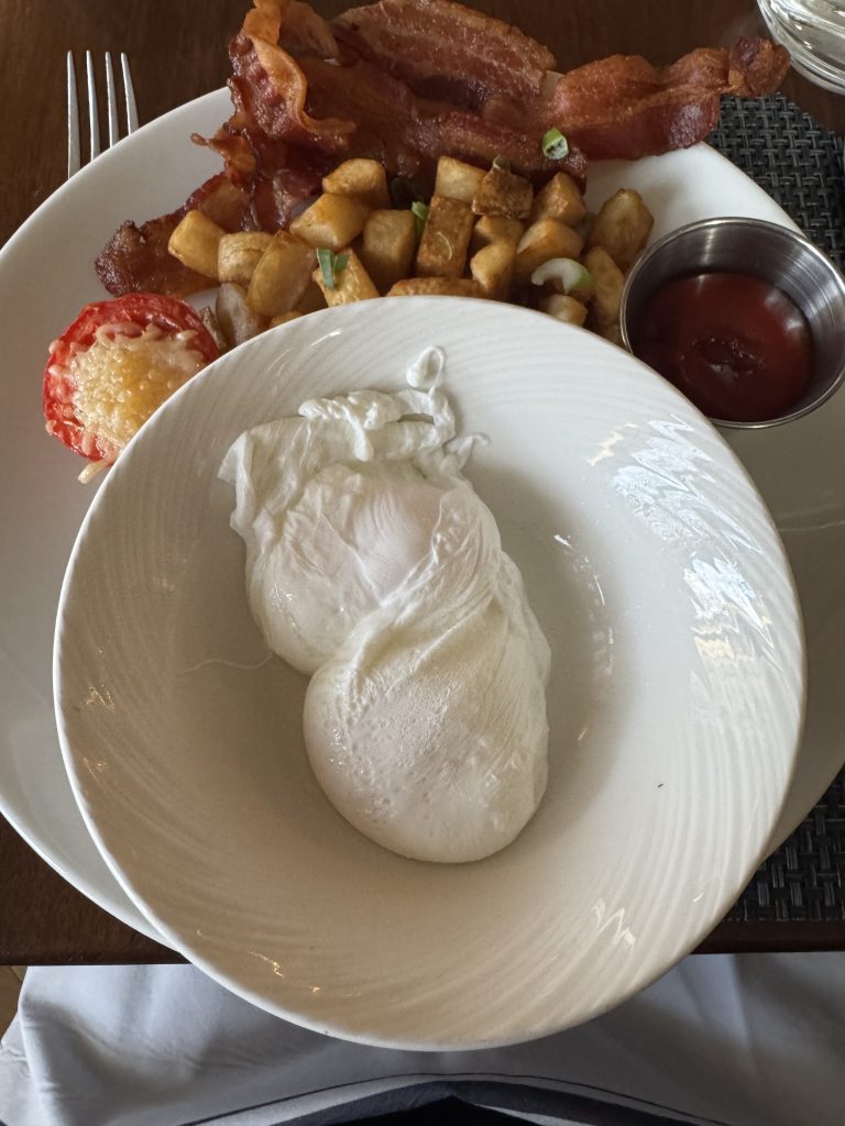 This is of course one of Washington’s classical hotels, visited by every president since Franklin Pierce. The breakfast was menu only, i.e., no buffet, and the tea was (of course!) bags only. Somewhat disappointingly the menu did not offer ‘simple; options, like just toast. However, this is the United States, so all you had to do was ask and you were given. A somewhat larger party than usual meant that we were able to sample quite a few dishes. They were uniformly very good. The poached eggs were just right and the bacon was crispy, as were the eggs Benedict. Good waffles and both the berrries bowl and the fruit palate were very nice. Portions just the right size. Overall, well worth 7/10.