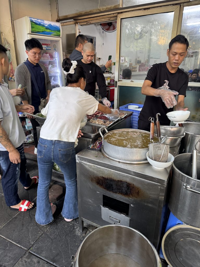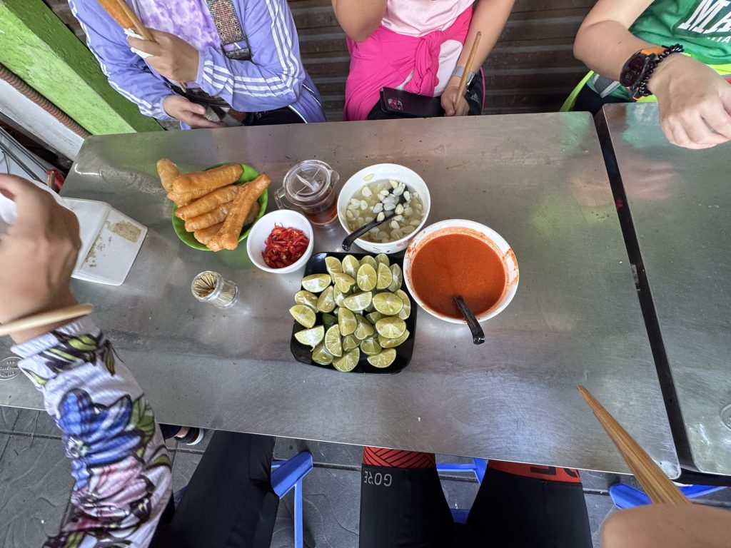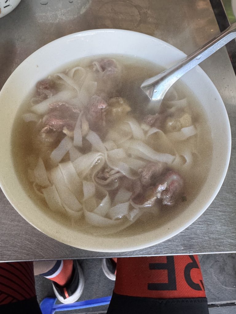 OK, it’s unlikely that readers will come upon this place, but – a breakfast is a breakfast. And I am temporarily spending Sunday mornings in Hanoi biking with a very friendly informal club, whose rides always include a breakfast break; and indeed a coffee break. I wonder if they actually bike to eat. So: the traditional breakfast is phở, the ‘national dish’ of Vietnam, a noodle soup with beef or chicken or fish. In today’s case, beef (phở bò = beef phở). On the one hand, my fellow bikers said this phở should rank 9/10. But, on the other hand, I must say that I was not as enthused. In any case, this was a one-dish (albeit with variations) place and so I cannot really award it more than 4/10. Pass by and try it. But not somewhere you specifically go to eat from more than, say, a block away.