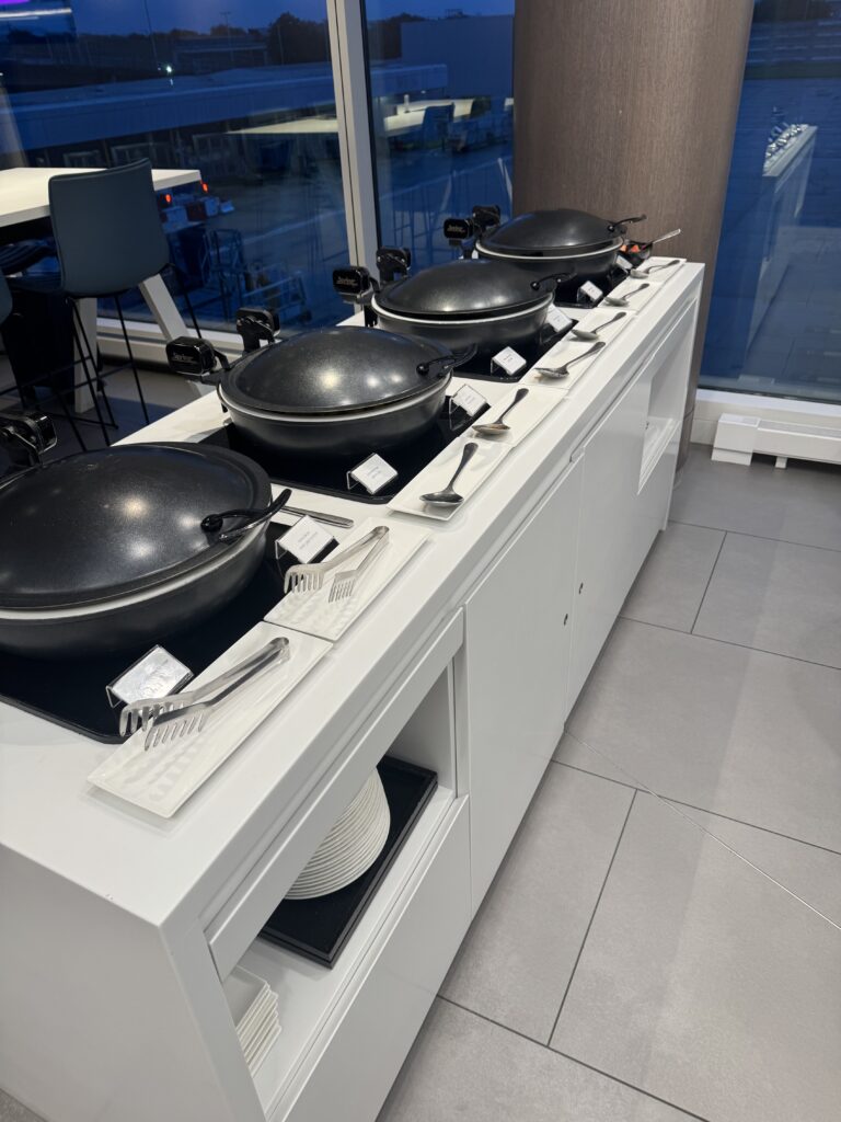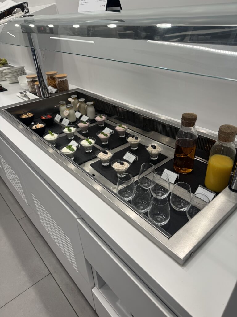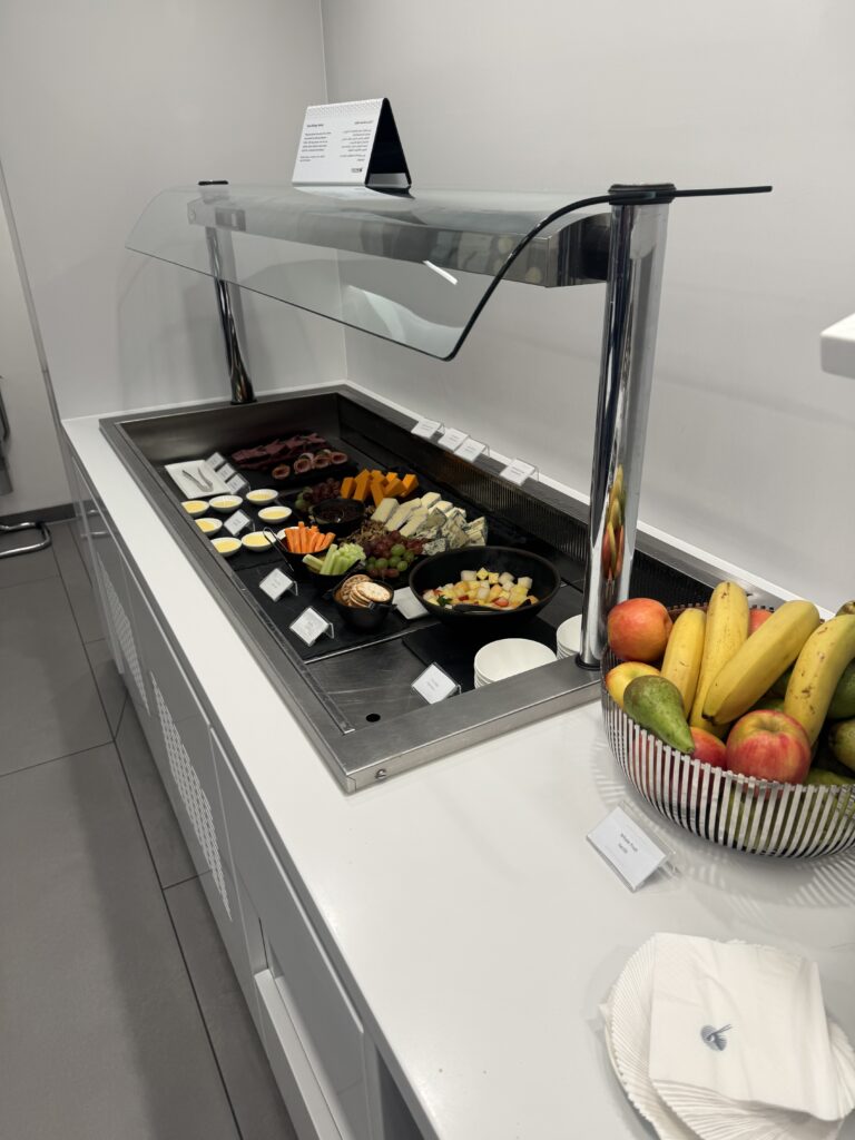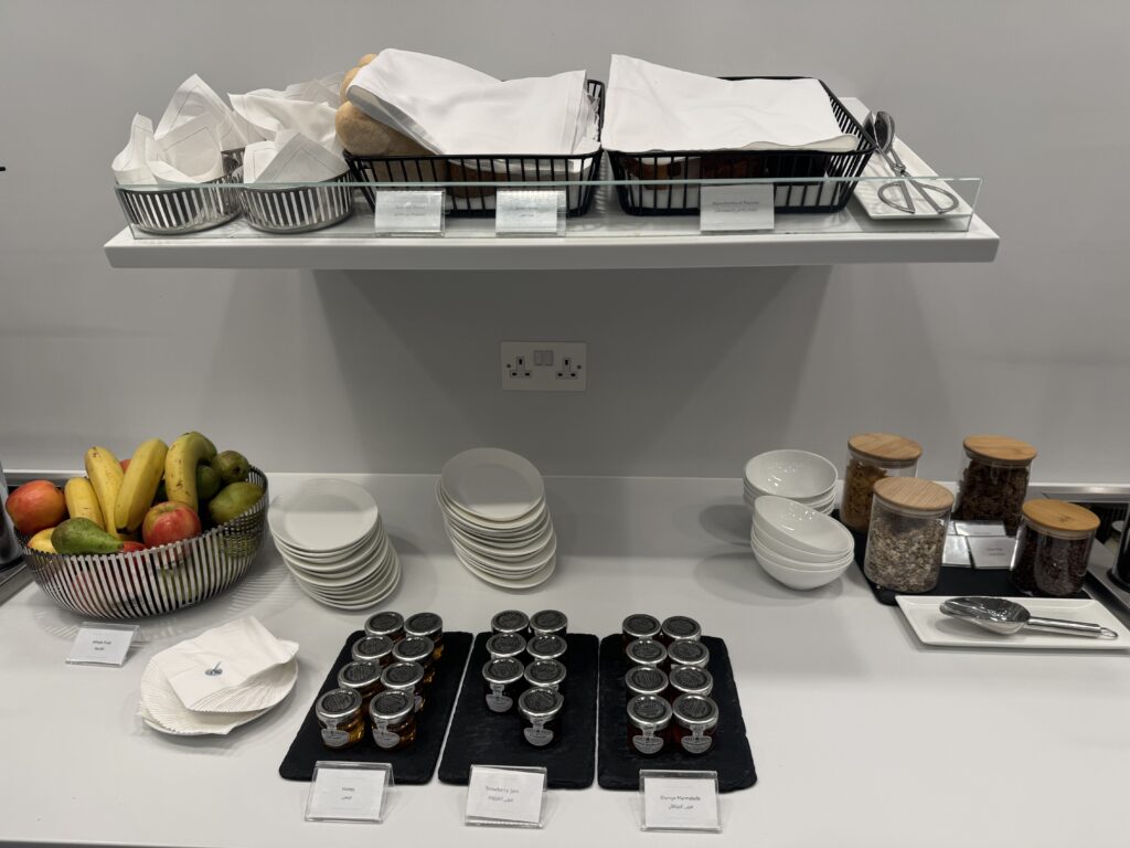 A perfectly decent breakfast. It is a small buffet, some warm dishes a decent spread of called the dishes, including yoghurts, serial, fresh fruit, cheese and some cold cuts. All the meat is of course halal. On the negative side, the tea is bags only, but that is to be expected. The bread is not entirely fresh and the croissants are quite soft. The scrambled eggs were very very slightly on the stodgy side. Nevertheless, the overall impression is absolutely fine and the 4.5/10 is pretty much what you would expect from a good airline, where you do not have access to the first class facilities.