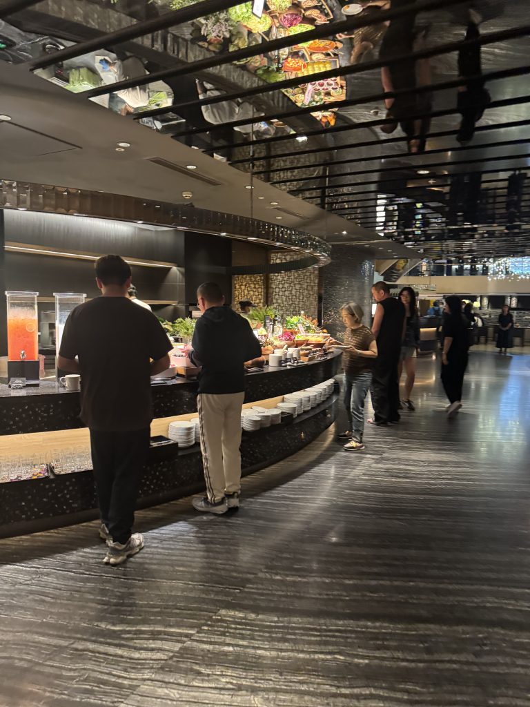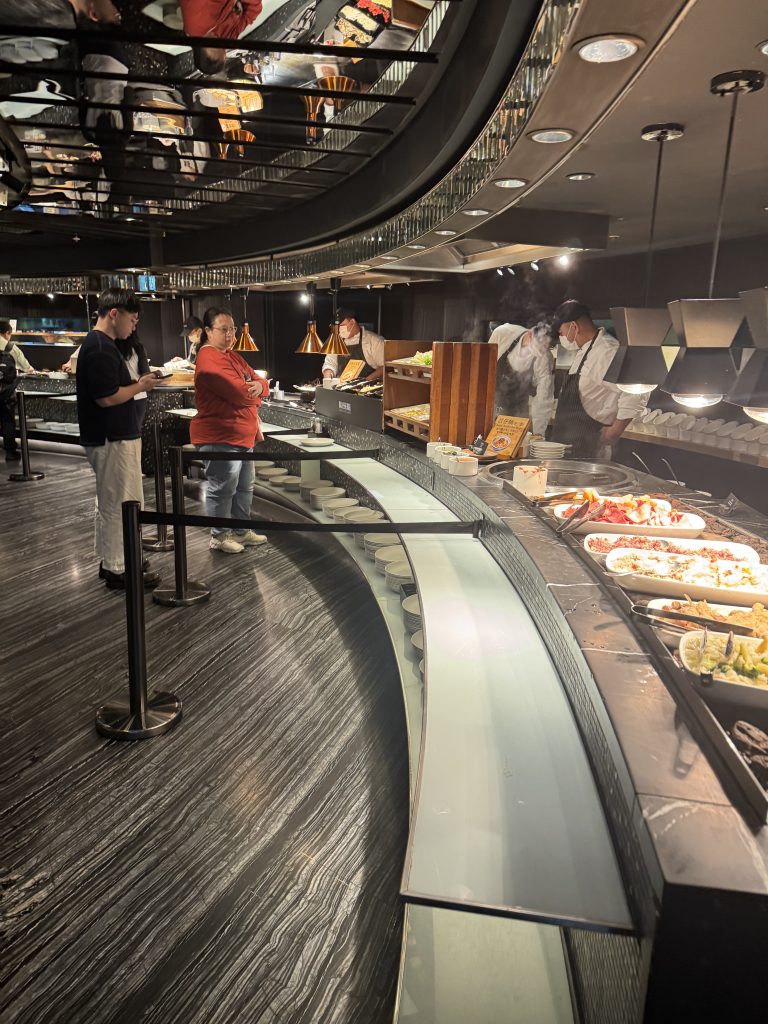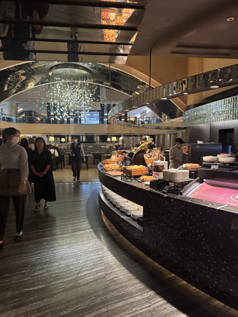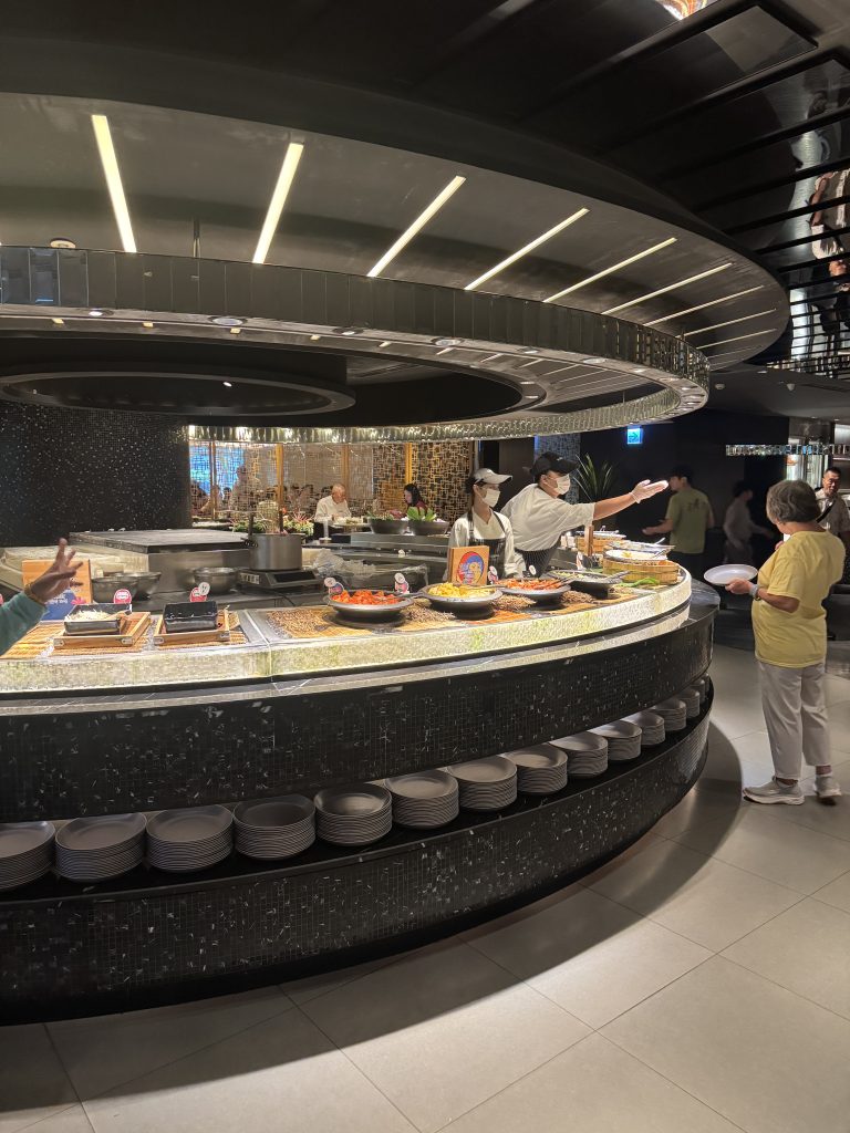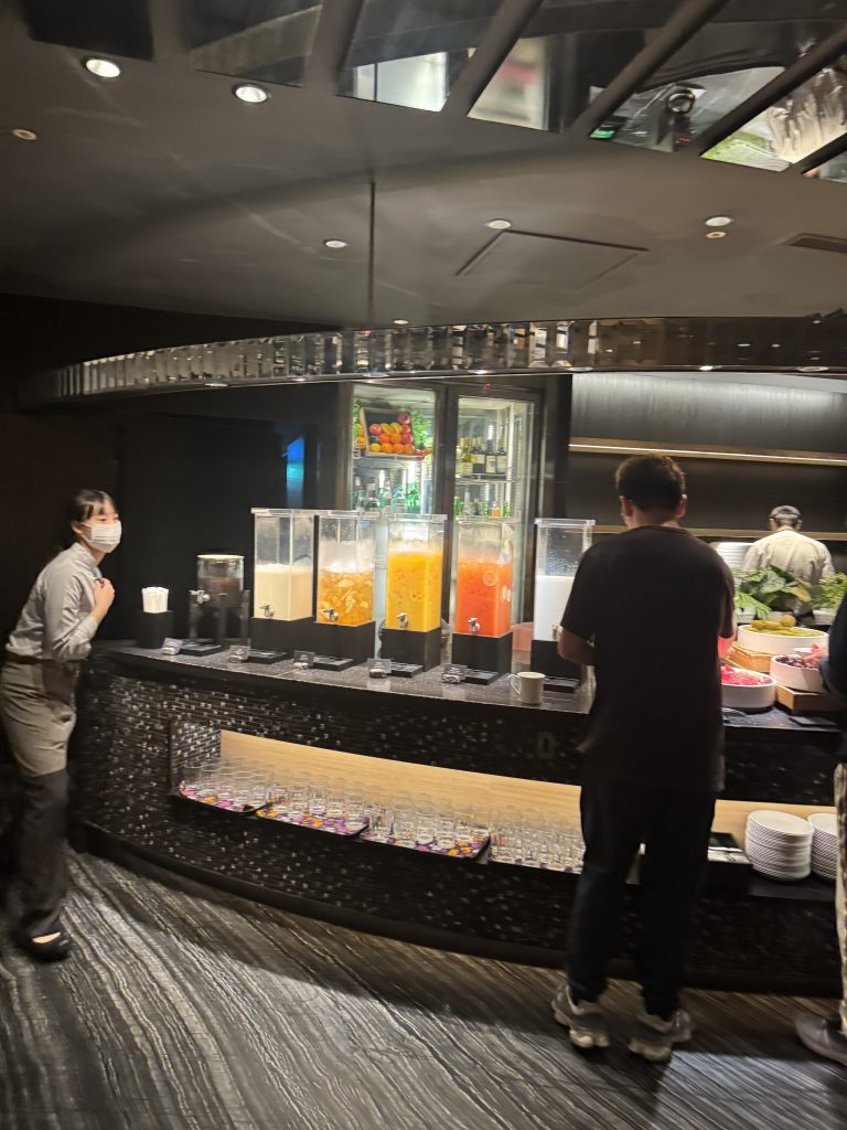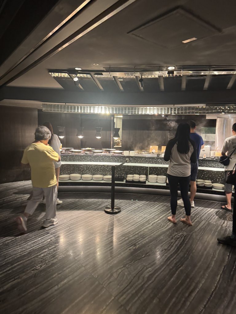 This was an excellent breakfast, if with one or two very minor drawbacks. A fairly large buffet, featuring local food as well as western and regional. The Taiwanese specialties were delicious. The western food included a good choice of excellent bread,, some of them with a local tinge, various salads (I particularly liked the tomato salad where multicoloured tomatoes were matched by multicoloured pasta.) Also a nice choice of cold cuts and cheese. Both pancakes and waffles and good spread of condiments. The hot bar was impressive, again a mixture of cuisines. However the bacon didn’t look very appetising. I was puzzled by the lack of croissants, but this was explained when a lady turned up distributing (very nice) freshly baked croissants at peoples’ tables. And there was shakshuka, albeit called “scrambled eggs with tomatoes“. Drawbacks: The tea, a local oolong, was bags. That should not be the case in a hotel of this standard. And the shakshuka was somewhat too spicy, tasting as if they had put mustard in it, which again should not have been the case. Nevertheless, these are minor complaints and the breakfast is easily worth 9/10. In fact, I have already booked again for tomorrow.